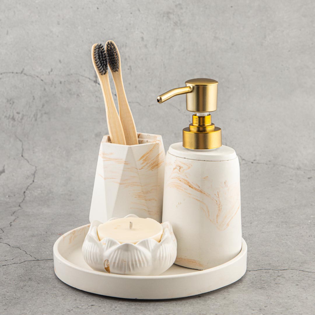 Upgrade your bathroom with the Aqua Flora Set. This ensemble features a round tray, soap dispenser, candle stand, and a toothbrush holder, all adorned with a graceful floral motif. The Aqua Flora set brings a touch of elegance and organization to your bathroom, creating a soothing atmosphere for your daily routines and moments of relaxation.